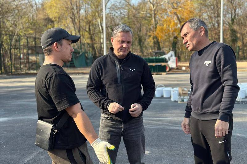 - Заканчиваем периметральное ограждение, благоустройство прилегающей территории, ремонт здания тренерской раздевалки отделения тенниса, - сообщил градоначальник. – Идет обустройство теннисных кортов современным, профессиональным покрытием - хард. Современное освещение кортов также будет установлено для улучшения условий игры.